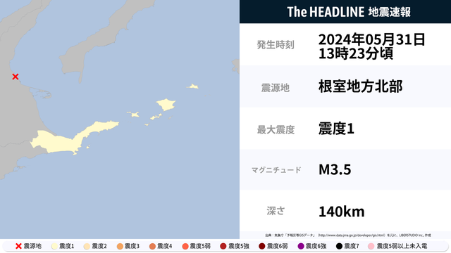 5月31日13時23分頃、根室地方北部を震源とするマグニチュード3.5の地震が観測された。最大震度1を観測したのは、北海道。
