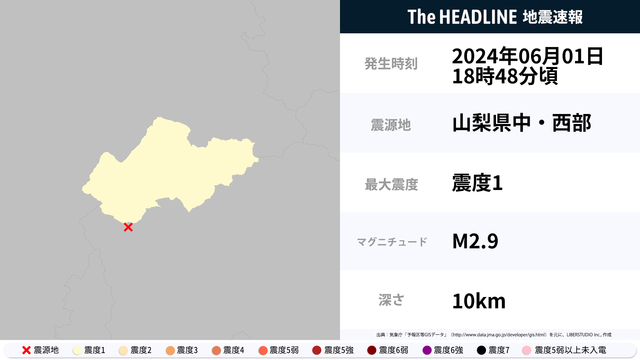 6月1日18時48分頃、山梨県で最大震度1の地震を観測