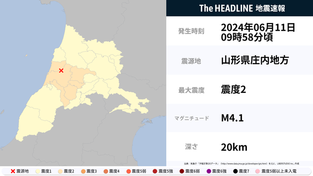 6月11日9時58分頃、山形県で最大震度2の地震を観測