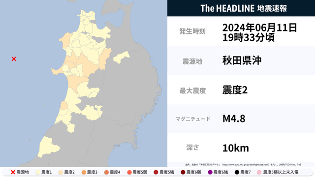 6月11日19時33分頃、秋田県沖を震源とするマグニチュード4.8の地震が観測された。最大震度2を観測したのは、青森県・秋田県。
