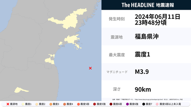 6月11日23時48分頃、福島県沖を震源とするマグニチュード3.9の地震が観測された。最大震度1を観測したのは、岩手県・宮城県など。