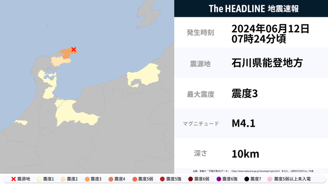 6月12日7時24分頃、石川県能登地方を震源とするマグニチュード4.1の地震が観測された。最大震度3を観測したのは、石川県。