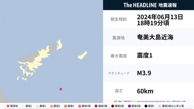 6月13日18時19分頃、奄美大島近海を震源とするマグニチュード3.9の地震が観測された。最大震度1を観測したのは、鹿児島県。