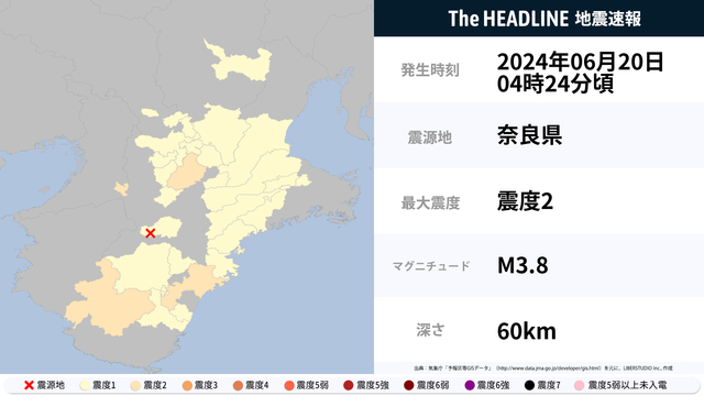 6月20日4時24分頃、奈良県を震源とするマグニチュード3.8の地震が観測された。最大震度2を観測したのは、三重県・大阪府など。