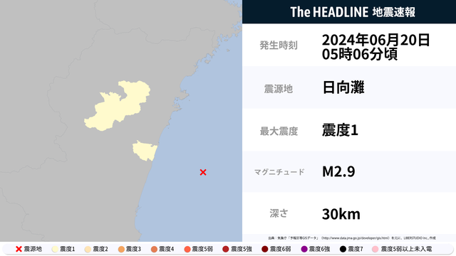 6月20日5時6分頃、日向灘を震源とするマグニチュード2.9の地震が観測された。最大震度1を観測したのは、宮崎県。