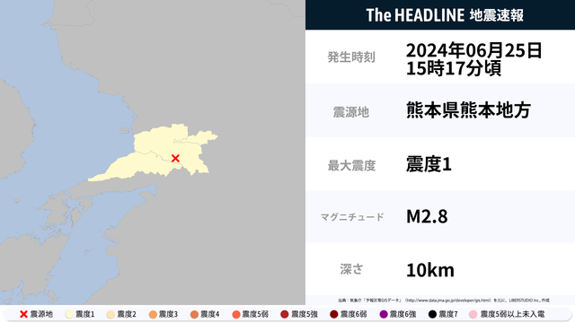 06月25日15時17分頃、熊本県熊本地方を震源とするマグニチュード2.8の地震が観測された。最大震度1を観測したのは、熊本県。