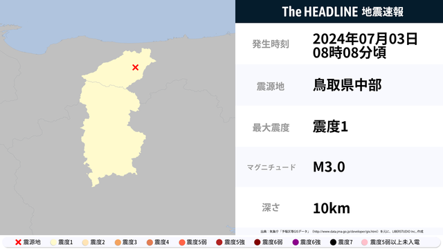 7月3日8時8分頃、鳥取県中部を震源とするマグニチュード3.0の地震が観測された。最大震度1を観測したのは、鳥取県・岡山県。