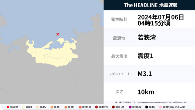 7月6日4時15分頃、若狭湾を震源とするマグニチュード3.1の地震が観測された。最大震度1を観測したのは、福井県。