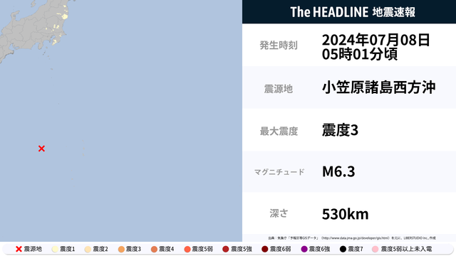 07月08日05時01分頃、小笠原諸島西方沖を震源とするマグニチュード6.3の地震が観測された。最大震度3を観測したのは、東京都。