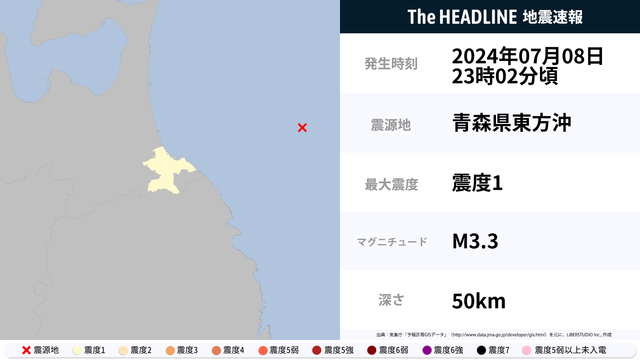 7月8日23時2分頃、青森県東方沖を震源とするマグニチュード3.3の地震が観測された。最大震度1を観測したのは、青森県。