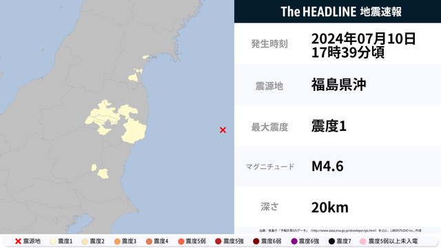 7月10日17時39分頃、福島県沖を震源とするマグニチュード4.6の地震が観測された。最大震度1を観測したのは、宮城県・福島県など。