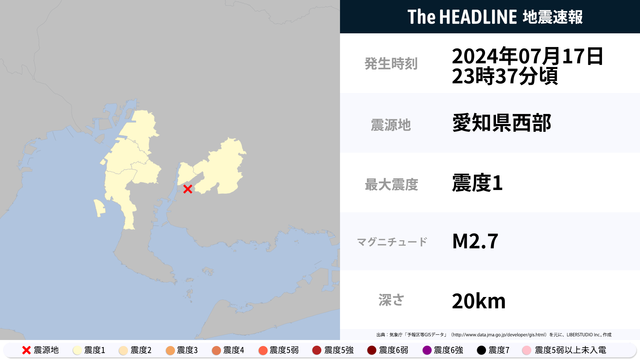 7月17日23時37分頃、愛知県西部を震源とするマグニチュード2.7の地震が観測された。最大震度1を観測したのは、愛知県。