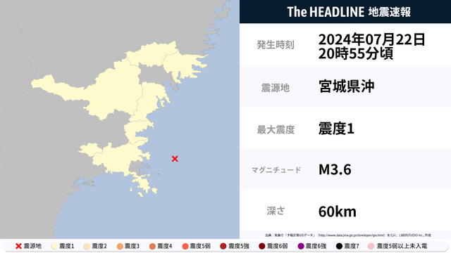 7月22日20時55分頃、宮城県沖を震源とするマグニチュード3.6の地震が観測された。最大震度1を観測したのは、岩手県・宮城県。