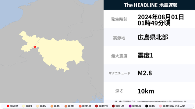 08月01日01時49分頃、広島県北部を震源とするマグニチュード2.8の地震が観測された。最大震度1を観測したのは、島根県・広島県。