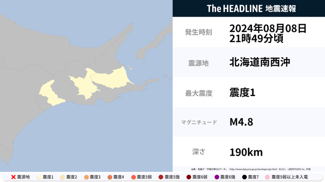 08月08日21時49分頃、北海道南西沖を震源とするマグニチュード4.8の地震が観測された。最大震度1を観測したのは、北海道。