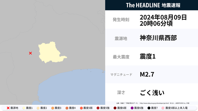 8月9日20時6分頃、神奈川県西部を震源とするマグニチュード2.7の地震が観測された。最大震度1を観測したのは、神奈川県。