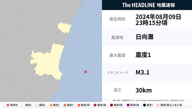 8月9日23時15分頃、日向灘を震源とするマグニチュード3.1の地震が観測された。最大震度1を観測したのは、宮崎県。