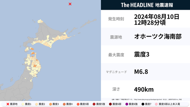 8月10日12時28分頃、オホーツク海南部を震源とするマグニチュード6.8の地震が観測された。最大震度3を観測したのは、北海道・青森県など。