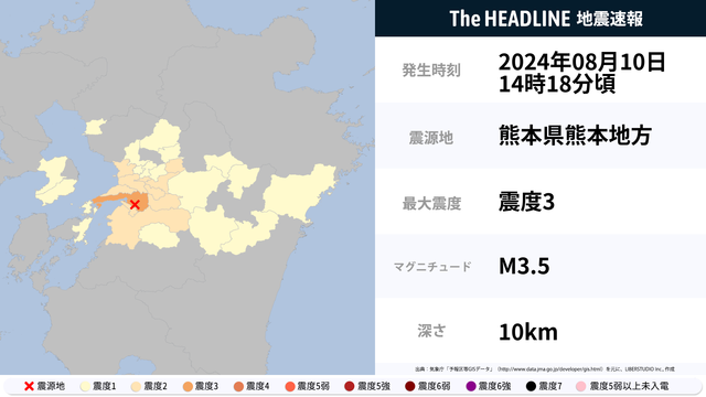 8月10日14時18分頃、熊本県で最大震度3の地震を観測