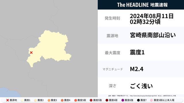 8月11日2時32分頃、宮崎県で最大震度1の地震を観測