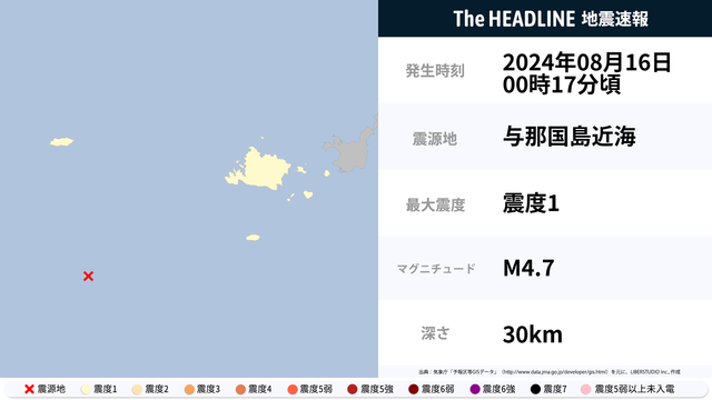 8月16日0時17分頃、与那国島近海を震源とするマグニチュード4.7の地震が観測された。最大震度1を観測したのは、沖縄県。
