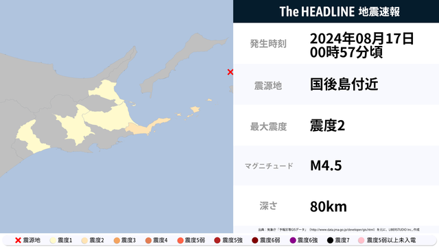 8月17日0時57分頃、国後島付近を震源とするマグニチュード4.5の地震が観測された。最大震度2を観測したのは、北海道。