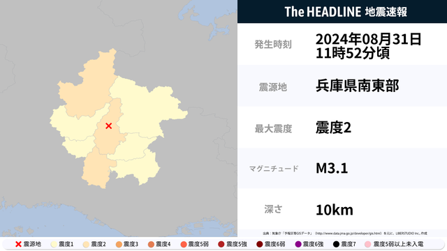 8月31日11時52分頃、兵庫県南東部を震源とするマグニチュード3.1の地震が観測された。最大震度2を観測したのは、兵庫県。