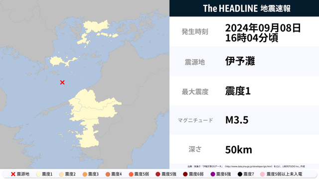 9月8日16時4分頃、伊予灘を震源とするマグニチュード3.5の地震が観測された。最大震度1を観測したのは、広島県・山口県など。