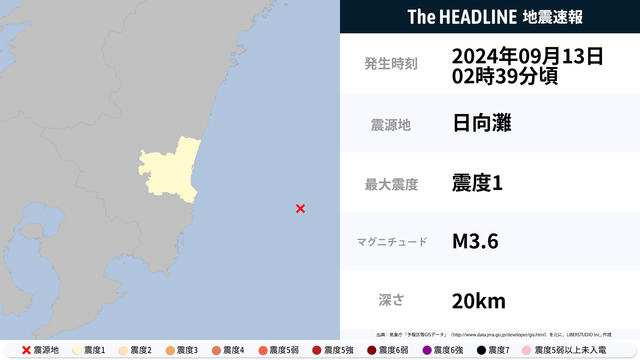 9月13日2時39分頃、日向灘を震源とするマグニチュード3.6の地震が観測された。最大震度1を観測したのは、宮崎県。