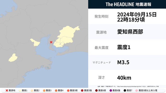 9月15日22時18分頃、愛知県・三重県などで最大震度1の地震を観測