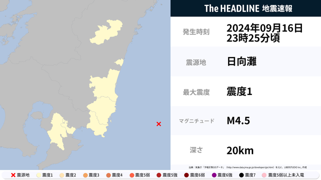 9月16日23時25分頃、日向灘を震源とするマグニチュード4.5の地震が観測された。最大震度1を観測したのは、宮崎県・鹿児島県。