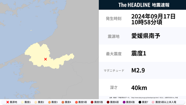 9月17日10時58分頃、愛媛県南予を震源とするマグニチュード2.9の地震が観測された。最大震度1を観測したのは、愛媛県。