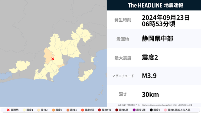 9月23日6時53分頃、静岡県中部を震源とするマグニチュード3.9の地震が観測された。最大震度2を観測したのは、静岡県。