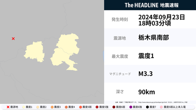 9月23日18時3分頃、栃木県南部を震源とするマグニチュード3.3の地震が観測された。最大震度1を観測したのは、茨城県。