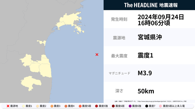 9月24日16時6分頃、宮城県沖を震源とするマグニチュード3.9の地震が観測された。最大震度1を観測したのは、宮城県・福島県。