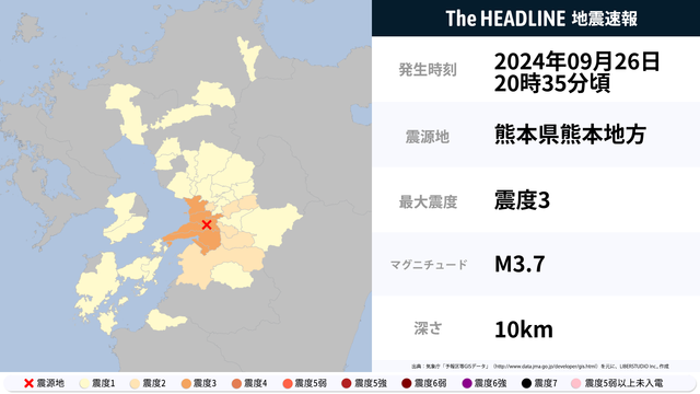 9月26日20時35分頃、熊本県で最大震度3の地震を観測