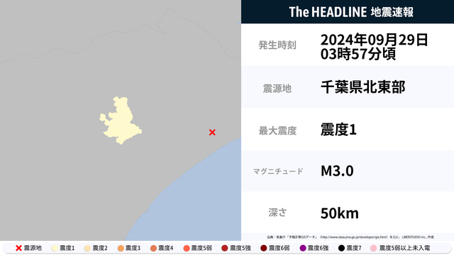 9月29日3時57分頃、千葉県で最大震度1の地震を観測