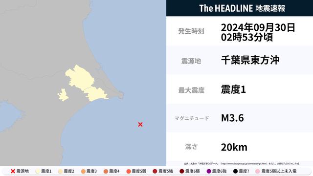 9月30日2時53分頃、千葉県東方沖を震源とするマグニチュード3.6の地震が観測された。最大震度1を観測したのは、千葉県。