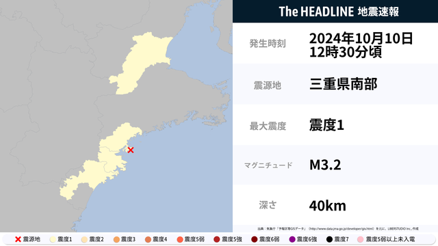 10月10日12時30分頃、三重県南部を震源とするマグニチュード3.2の地震が観測された。最大震度1を観測したのは、三重県。