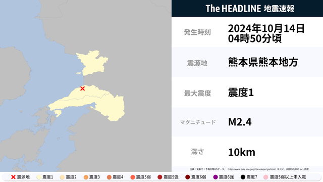 10月14日04時50分頃、熊本県熊本地方を震源とするマグニチュード2.4の地震が観測された。最大震度1を観測したのは、熊本県。