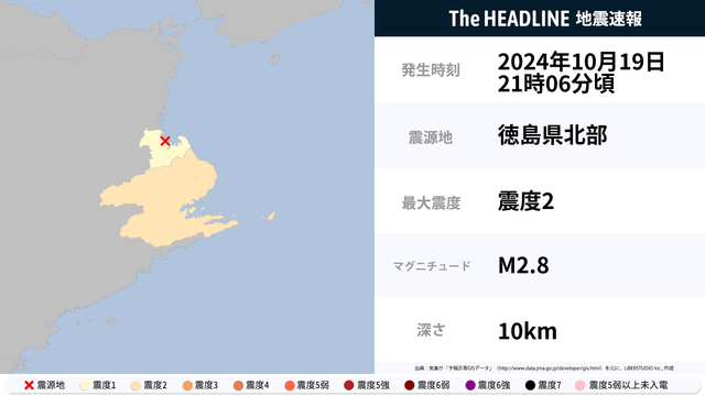 10月19日21時6分頃、徳島県北部を震源とするマグニチュード2.8の地震が観測された。最大震度2を観測したのは、徳島県。