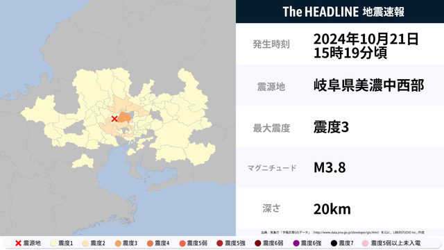 10月21日15時19分頃、岐阜県美濃中西部を震源とするマグニチュード3.8の地震が観測された。最大震度3を観測したのは、愛知県。