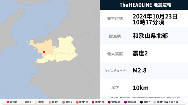 10月23日10時17分頃、和歌山県北部を震源とするマグニチュード2.8の地震が観測された。最大震度2を観測したのは、和歌山県。