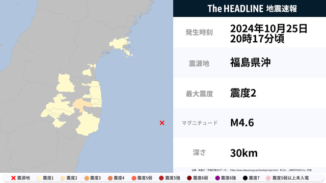 10月25日20時17分頃、福島県沖を震源とするマグニチュード4.6の地震が観測された。最大震度2を観測したのは、福島県。