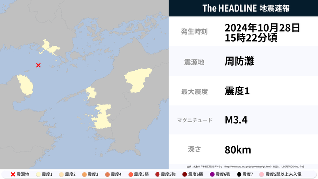 10月28日15時22分頃、山口県・愛媛県などで最大震度1の地震を観測