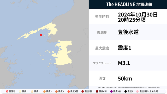 10月30日20時25分頃、豊後水道を震源とするマグニチュード3.1の地震が観測された。最大震度1を観測したのは、愛媛県。