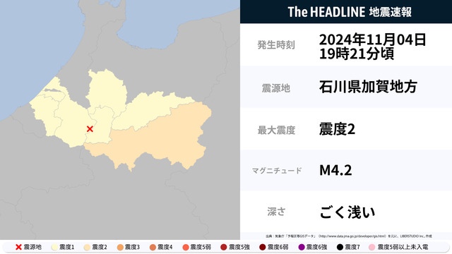 11月4日19時21分頃、石川県加賀地方を震源とするマグニチュード4.2の地震が観測された。最大震度2を観測したのは、岐阜県。