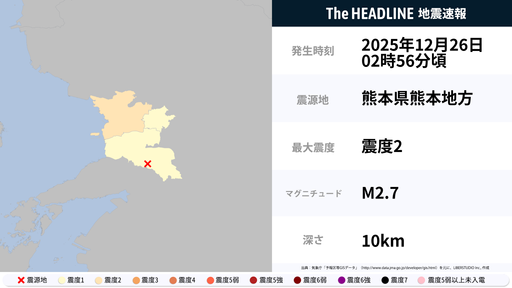 11月7日3時23分頃、熊本県熊本地方を震源とするマグニチュード1.9の地震が観測された。最大震度1を観測したのは、熊本県。