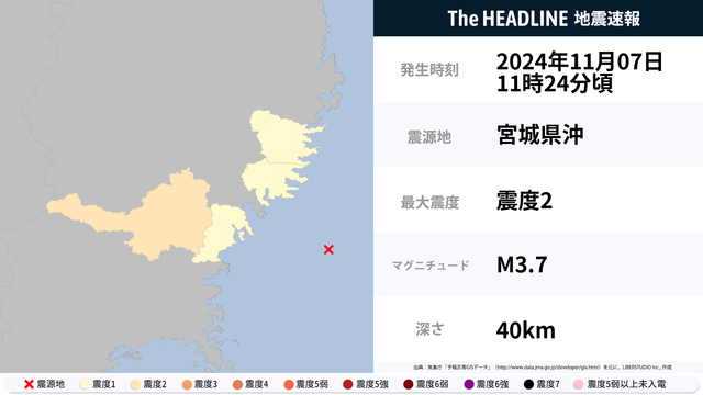 11月7日11時24分頃、宮城県沖を震源とするマグニチュード3.7の地震が観測された。最大震度2を観測したのは、岩手県。