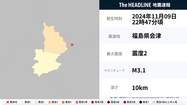 11月09日22時47分頃、福島県会津を震源とするマグニチュード3.1の地震が観測された。最大震度2を観測したのは、福島県。